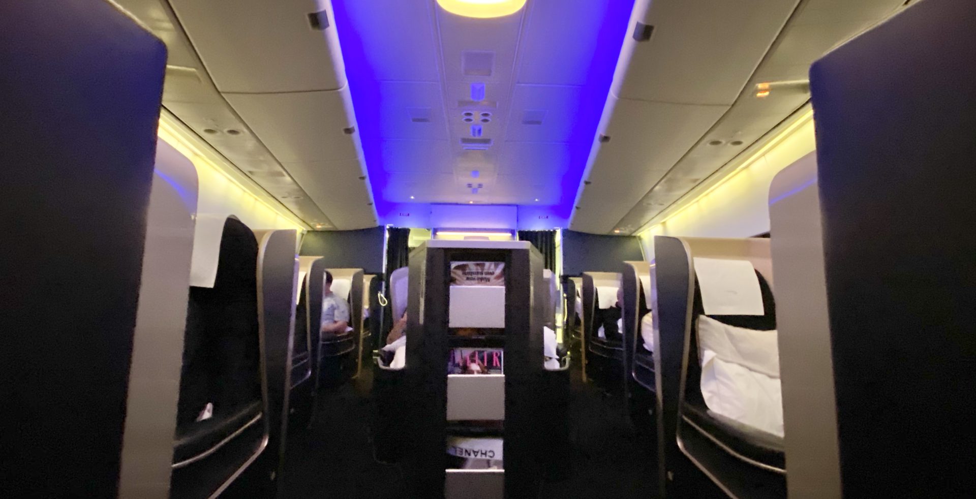In the sleeping position, the seat converted into a completely flat bed. The crew prepared this for us by putting a padded cover/topper on the seat and a luxurious cotton duvet over the top.