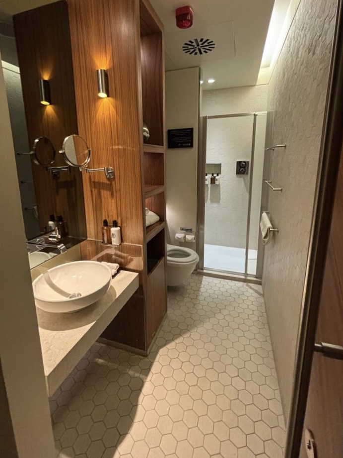 Restrooms and shower suites were located discreetly behind the Brasserie. Both were spotless, stylishly finished in marble and stocked with high-end Diptyque toiletries. The spacious showers and well-maintained facilities made for a pleasant and refreshing pre-flight experience.